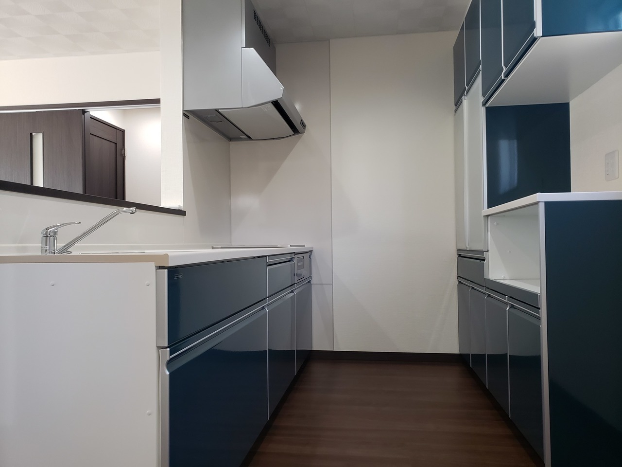 キッチン:タカラスタンダート ホーロー扉カラー:ブルーグリーン 手掛り:浅 シルバー 天板:アクリル人造大理石ソリットベージュ キッチンパネル:ロッシュベージュ レンジフード:シルバー