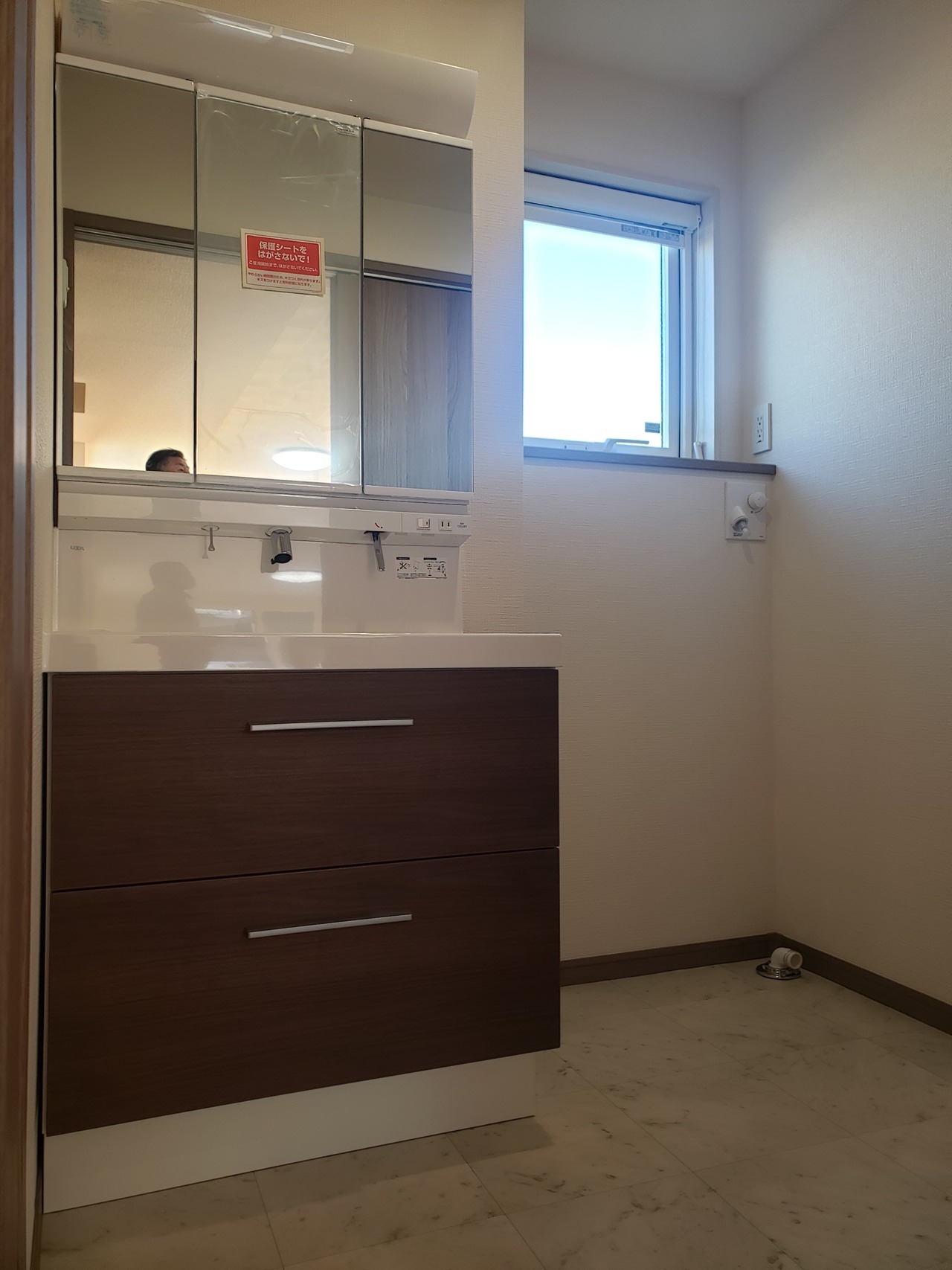 洗面脱衣室 床:CF シンコールE5101(石目調) 洗面台:LIXIL EV W750(三面鏡) フルスライド〈クリエモカ〉 笠木:ミディアムウッド