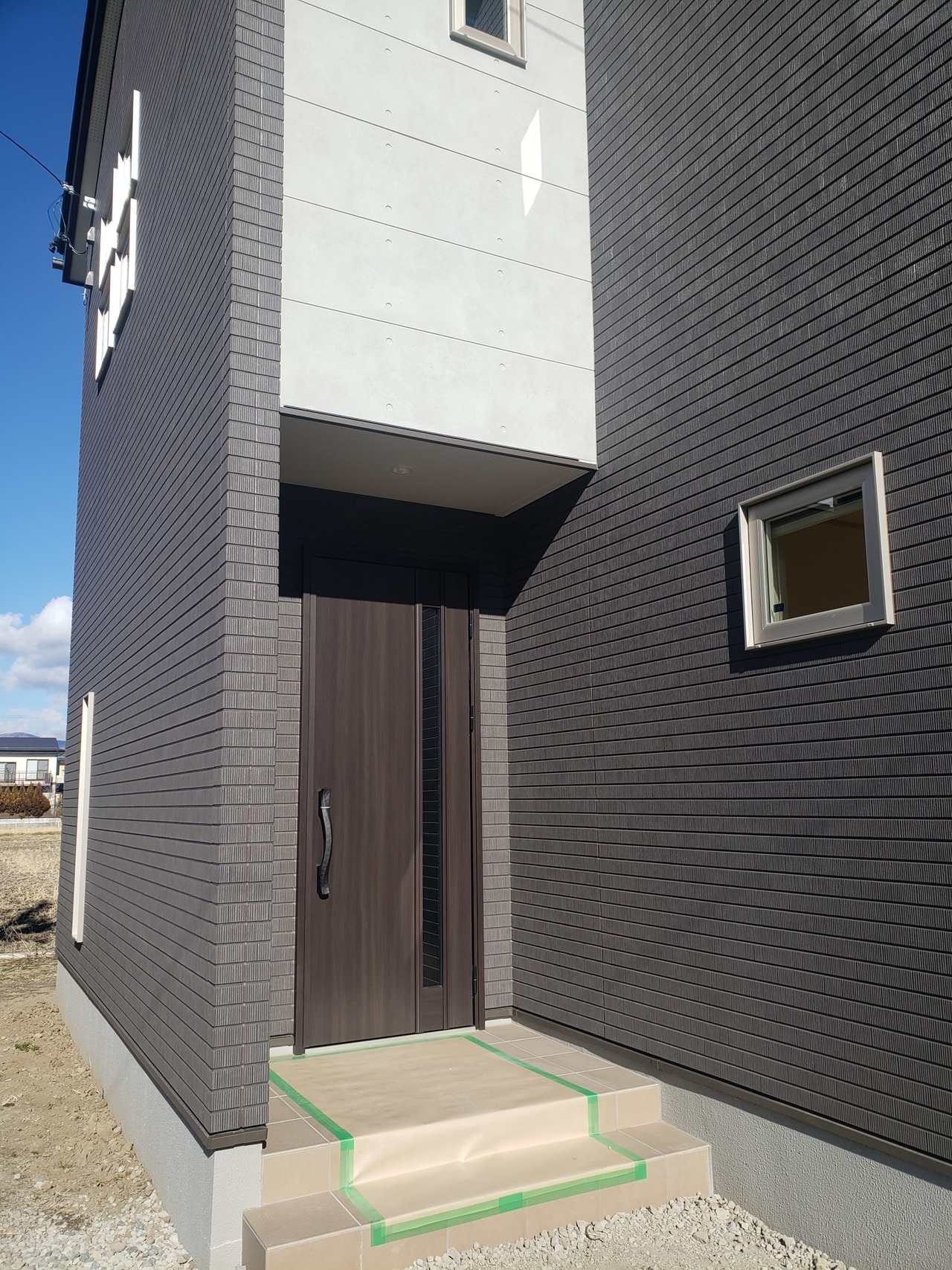 35坪4SLDK 南(左)玄関 間口4.5 外壁:ニチハ/モエンエクセラード16Vシリーズ❖ベース:ミラージュタイルV<エメMGチャコール> ❖アクセント:コンクリート打ちっ放し<コンクリートMGライトグレー> 屋根:茶 樋:オークブラウン 破風:茶 水切り:茶 笠木・サッシ枠:プラチナステン(外側)