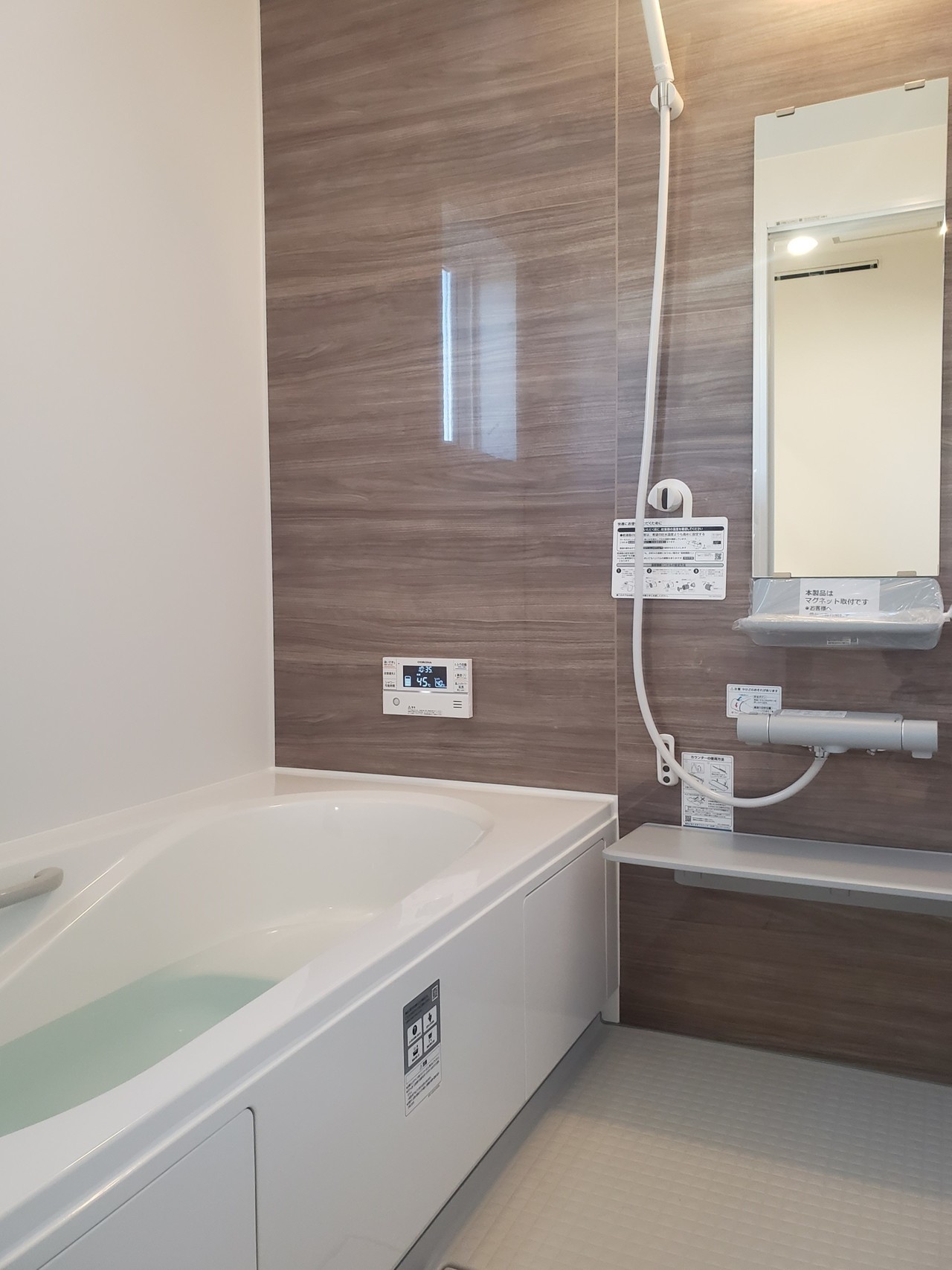 浴室:LIXIL「AX」1616サイズ 壁パネル/ベース:ホワイト(マット) アクセント:ウォールナット 浴槽:ホワイト・エコベンチ エプロン:ホワイト 床:ホワイト カウンター・収納:ライトグレー