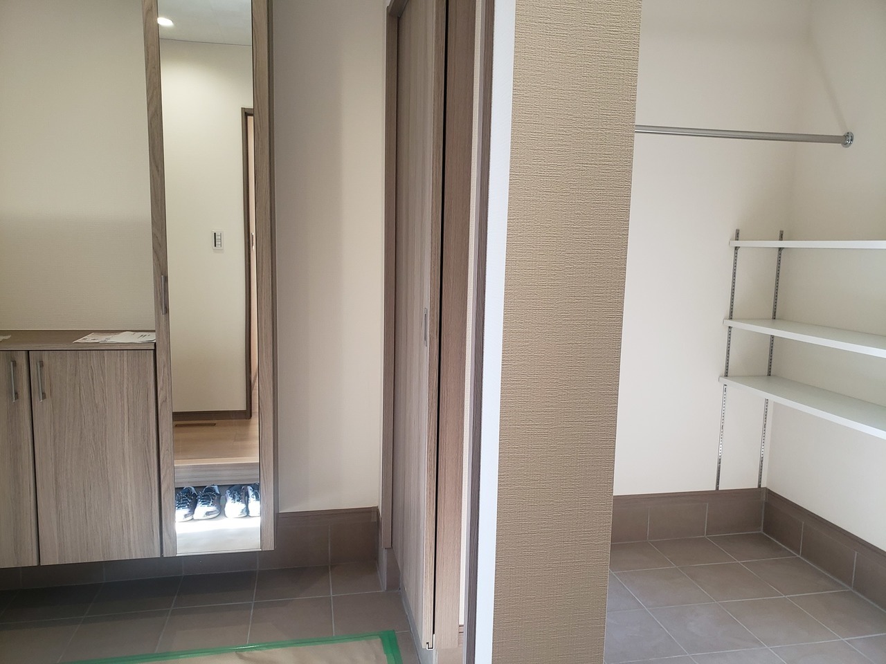 玄関収納:グレージュ 収納建具:ウッドワン<グレージュ> 玄関土間タイル:LIXIL コンテⅡ 300角 タイル(磁器質)CON-11 SIC棚:ホワイト・ハンガーパイプ