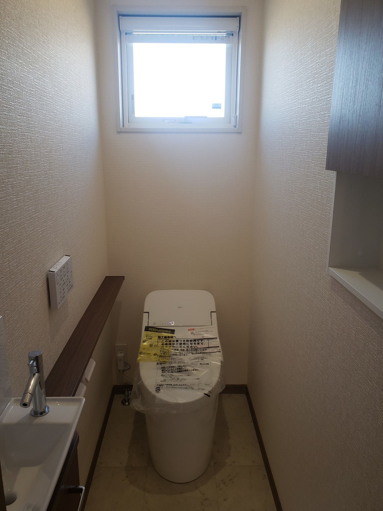 1F・2F トイレ 便器:TOTO GGーJ ホワイト キャビネット・カウンター:ミディアムウッド 窓枠:ホワイトウォールナット 壁:準不燃QM9448 床:CF シンコールE5101(石目調)