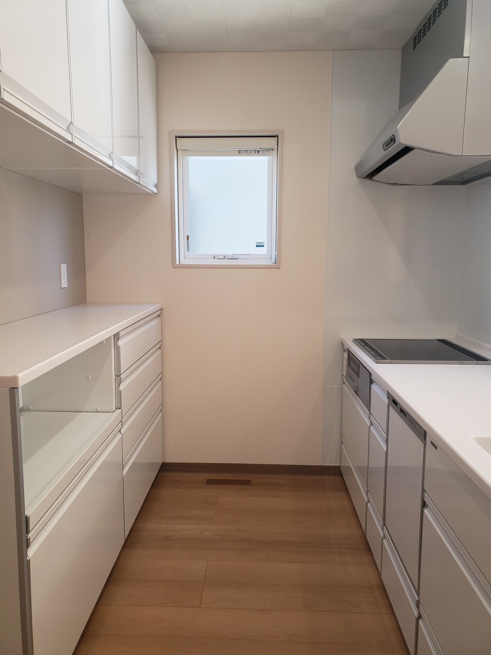 キッチン:タカラスタンダード キッチン扉:ホワイト キッチンパネル:マイルドホワイト 天板:人造大理石<ソリッドホワイト> 手掛り桟:扉サイドモール<シルバー> レンジフード:シルバー