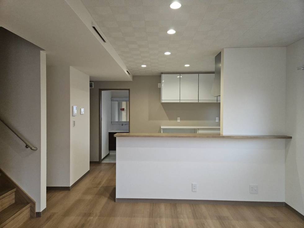 (DK側 床:EIDAIアトムフィットGM<ナチュラルオーク> カウンター・巾木:グレージュ アクセントクロス:キッチン背面<リリカラLV-3130(新番)>