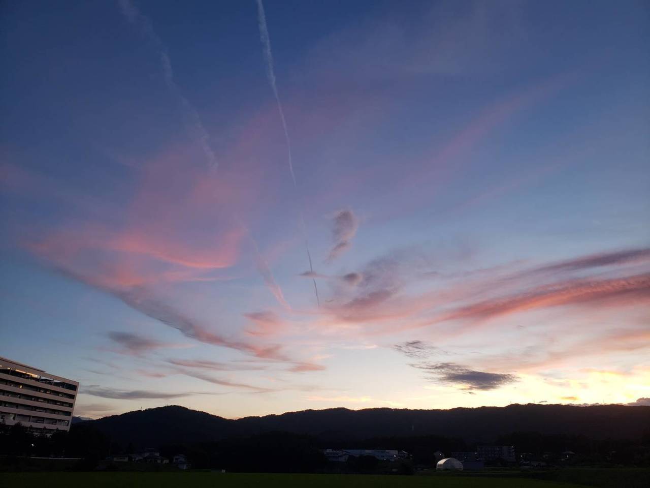 高い山々に囲まれていますが、高い建物が無いので、空は広く見渡すことができます。空に広がる、雲と光が織りなす美しい風景は、見る人の心を奪う絶景です。特に、夕焼けや朝焼けの時間帯には、空一面を染める鮮やかな色彩と、雲の形が織りなす光景が、幻想的な雰囲気を醸し出し、見る者に感動を与えます。私も感動してしまう一人です。この日の空の景色は、天女の羽衣が広がって夕日に照らされているような美しい光景で、飛行機雲もいい仕事をしていました。