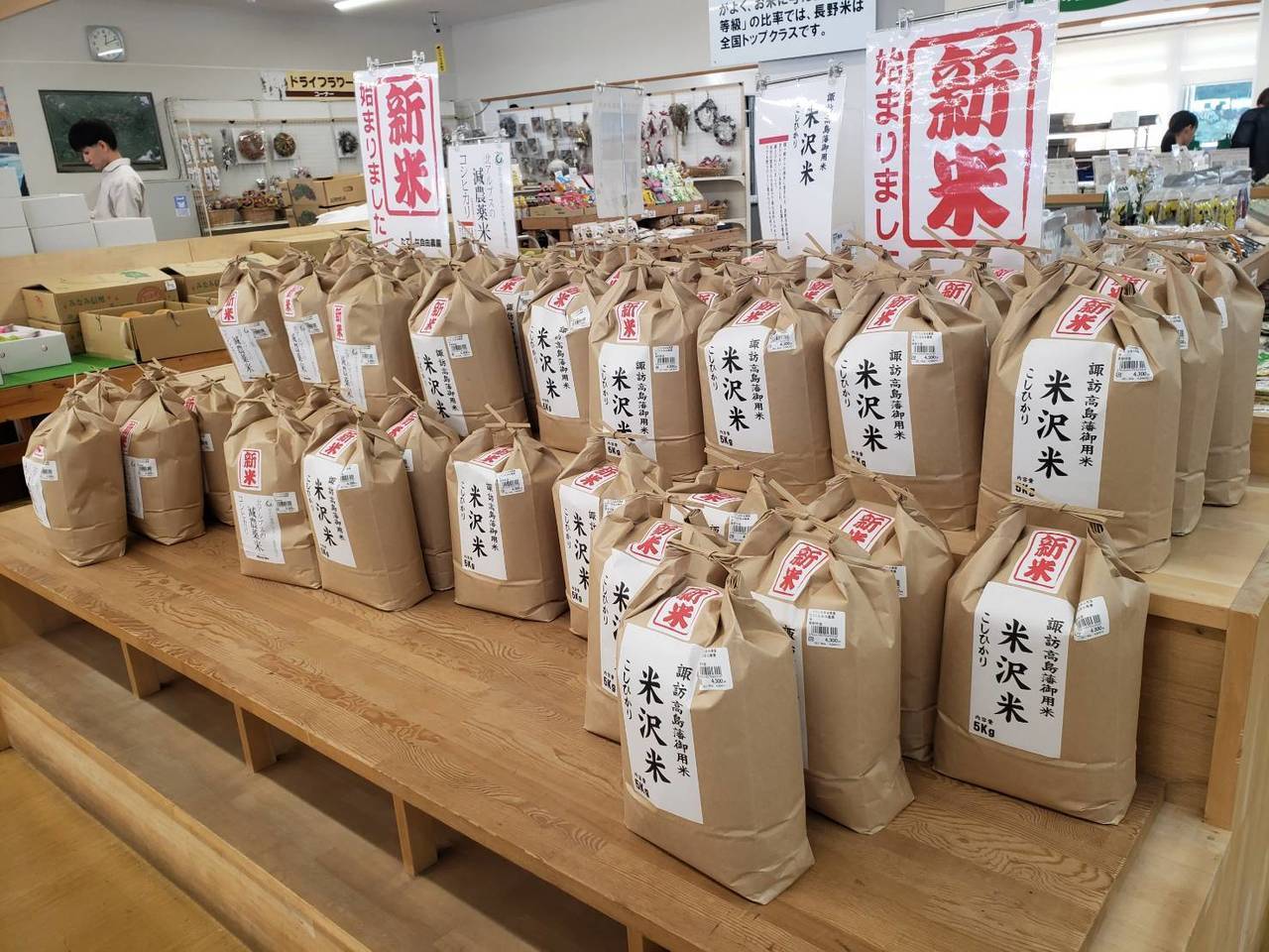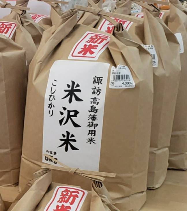 茅野市米沢の※たてしな自由農園 茅野店 さんの店頭にずらーっと並んだ新米の「米沢米こしひかり」。5㎏で4,300円(税別)で販売されていました。隣には「北アルプスの減農薬米こしひかり」5㎏4,300円(税別)の新米が並んでいました。新米なのでお値段は少しお高めですが、やはり新米は魅力的ですね♪